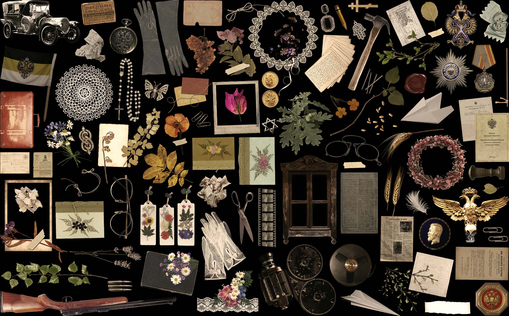 Одним из самых интересных этапов стал масштабный коллаж — настоящий альбом памяти. Мы собрали не только портреты героев, но и атмосферные детали: старые открытки, письма, засушенные цветы, кружева, ленты и рисунки. Каждый элемент подбирался вручную, чтобы создать нужное настроение.