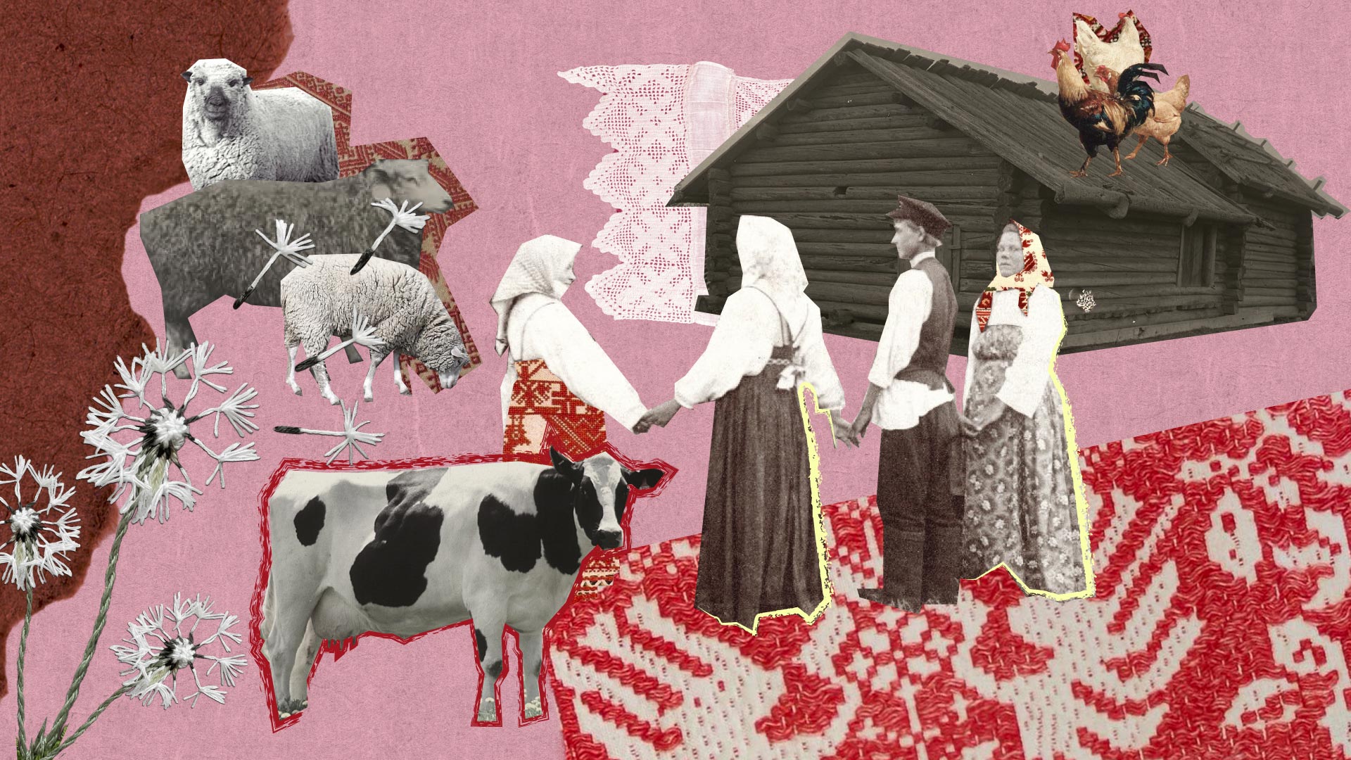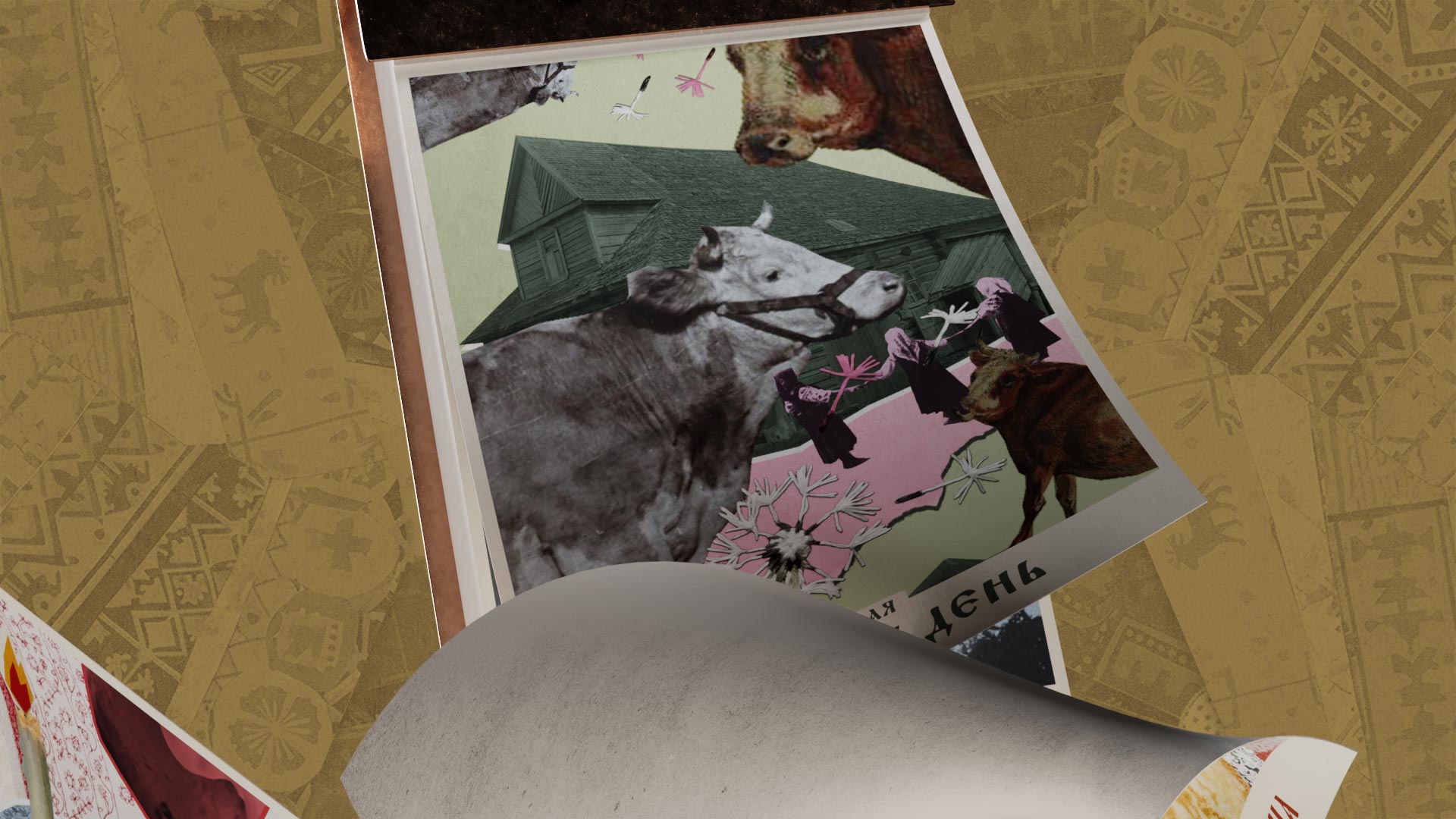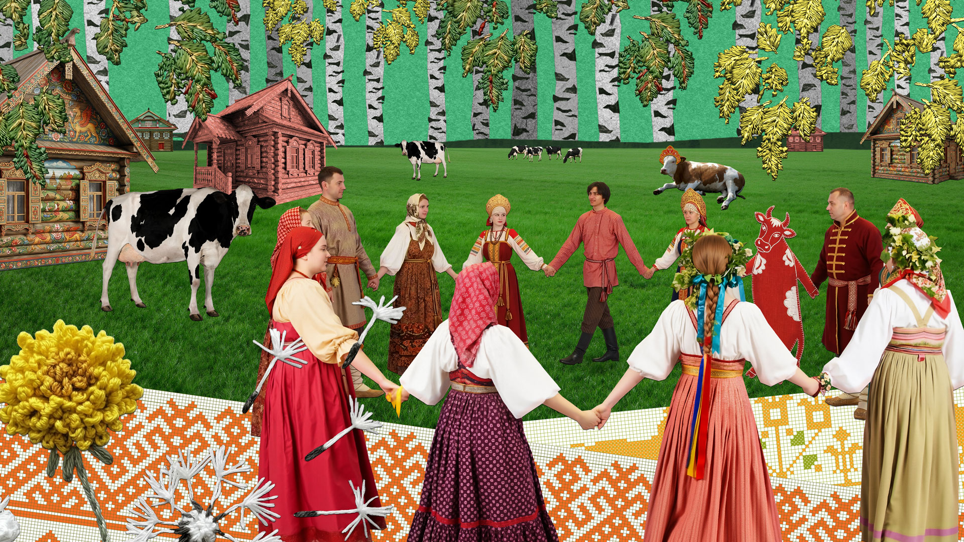 После анализа и обсуждений мы приступили ко второй итерации уже с более чёткими ограничениями. Существующий стиль графики телепередачи был эклектичен и построен на контрастах: архивные фотографии соседствовали с векторной графикой, композиции намеренно ломали перспективу, а яркие цвета добавляли современного «звучания». Особое внимание уделялось изображению русской деревни XIX века — с шероховатостями, несовершенствами и даже плохим качеством снимков, что подчеркивало её аутентичность. Мы отказались от стерильных и идеальных изображений, которые могли бы создать нейросети, и с энтузиазмом погрузились в процесс, экспериментируя с формами, композицией и цветами.