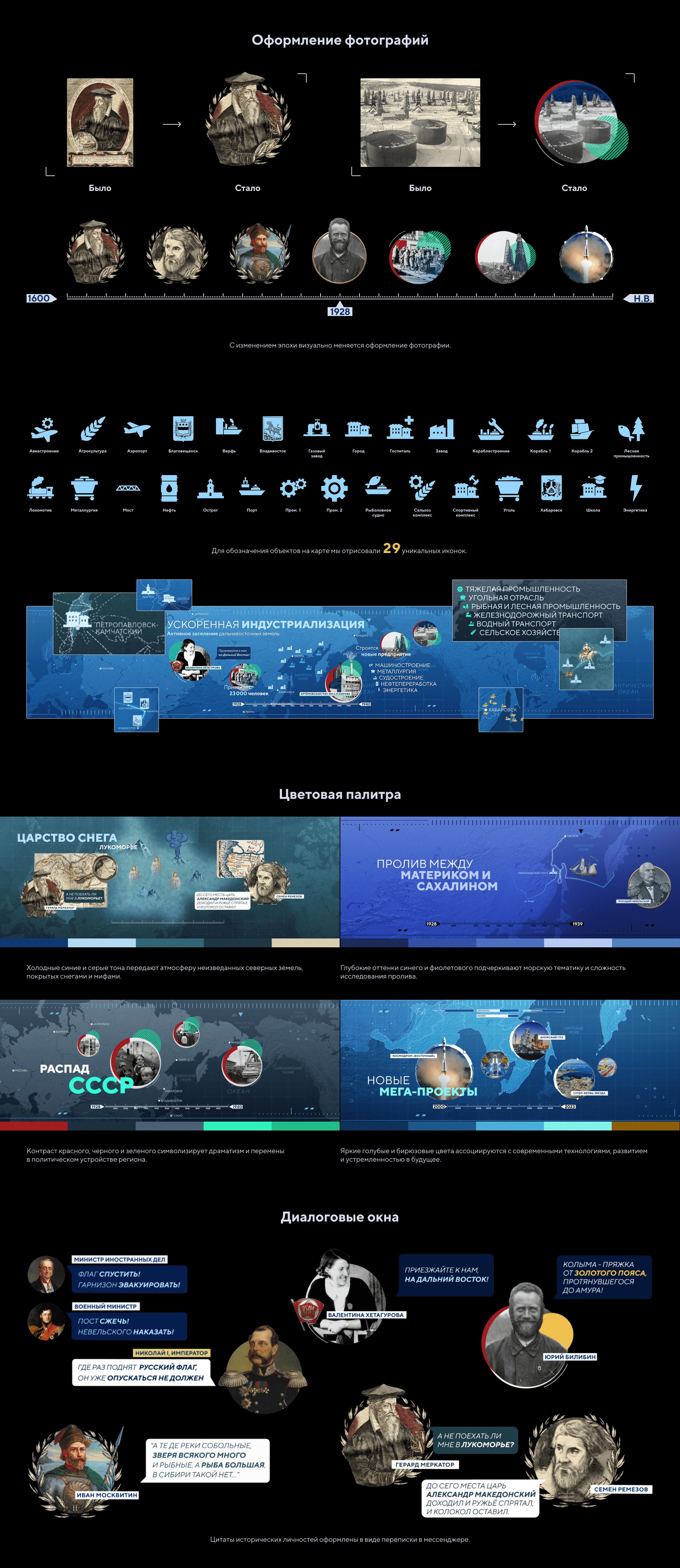 Проект стенда «Дальний Восток» на международной выставке-форуме «Россия» представляет собой визуальное путешествие через пять ключевых эпох освоения Дальнего Востока. Мы использовали карты, иллюстрации и фотографии, чтобы наглядно и доступно рассказать эту историю. Комбинированный подход позволяет не только продемонстрировать важные моменты, но и погрузить зрителей в атмосферу каждой исторической эпохи, создавая эффект вовлеченности и понимания пути развития региона.